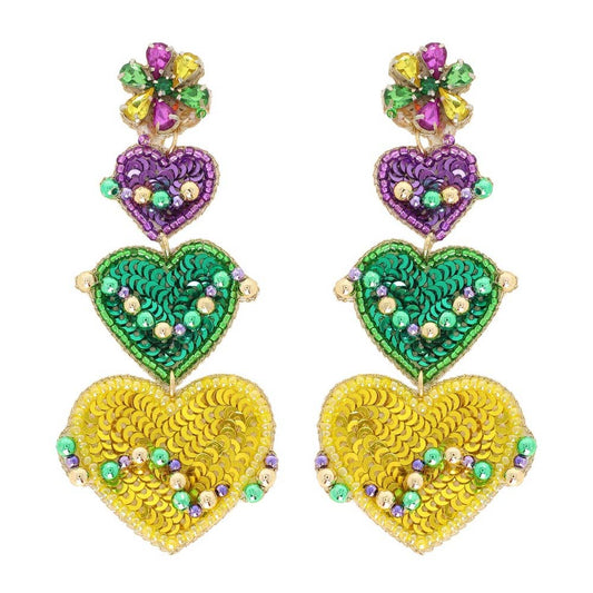 Mardi Gras Gemstone Beaded Heart Drop Earrings E13982PUMT